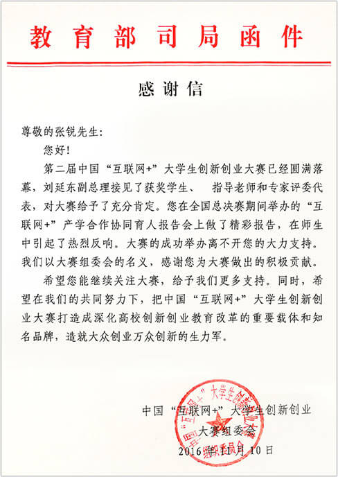2018年,优直播连续多年为中国国际互联网+大学生创新创业大赛做出积极贡献,获教育部来函致谢。